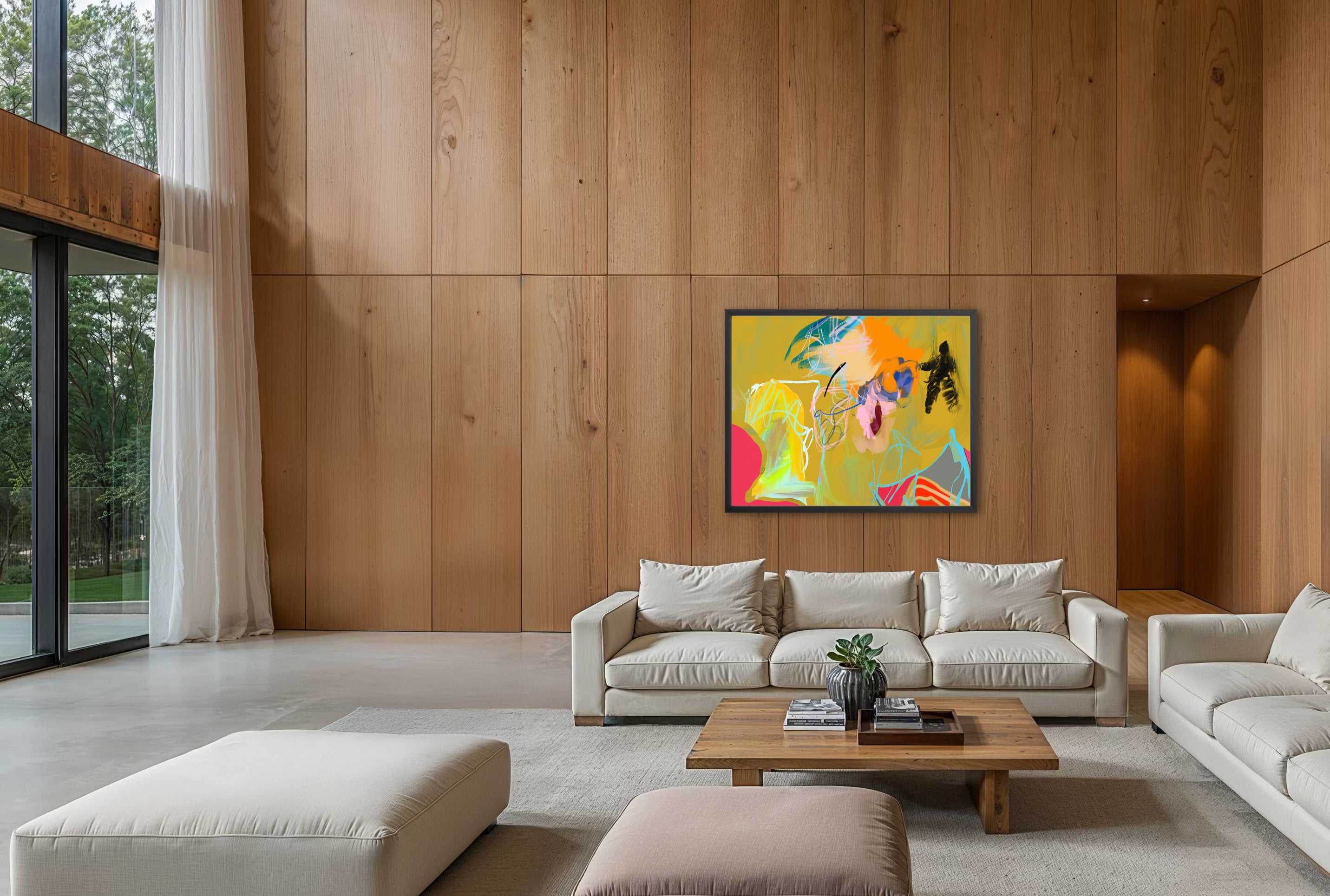 - Custom wood frame with D-rings for installation.