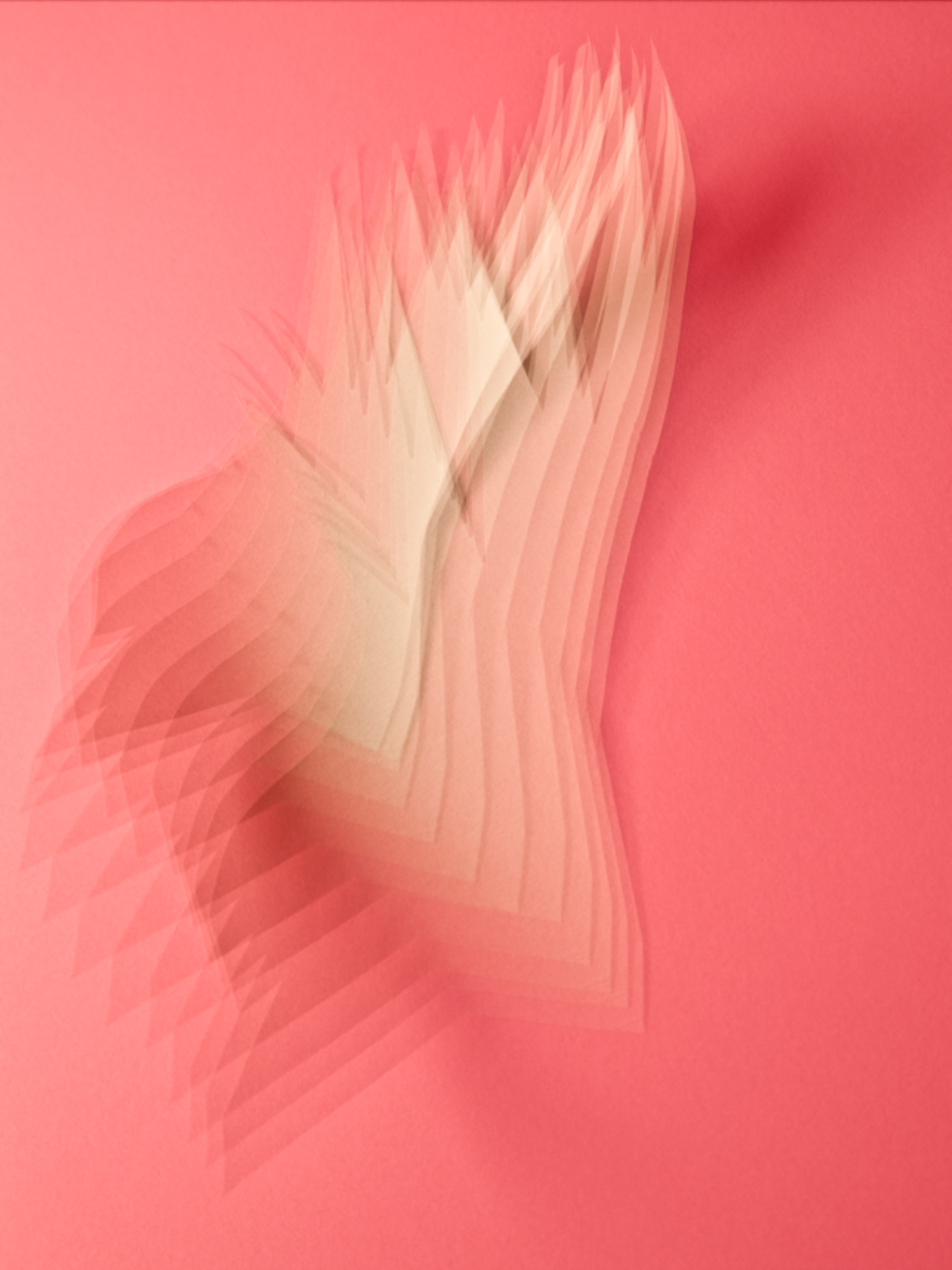 Echoes is an ongoing photographic series beginning in 2018. The process for this series involves creating minimalist color paper shapes, which the artist photographs while air currents slowly dance them around the artist and his camera, hand-held and set on long exposures. Like echoes of sonar fathoming the depth of an unknown yet somewhat familiar environment, the landscape-inspired forms created in these images with their different scale ratios, relay ideas of vastness, plains, cliffs, and summits.