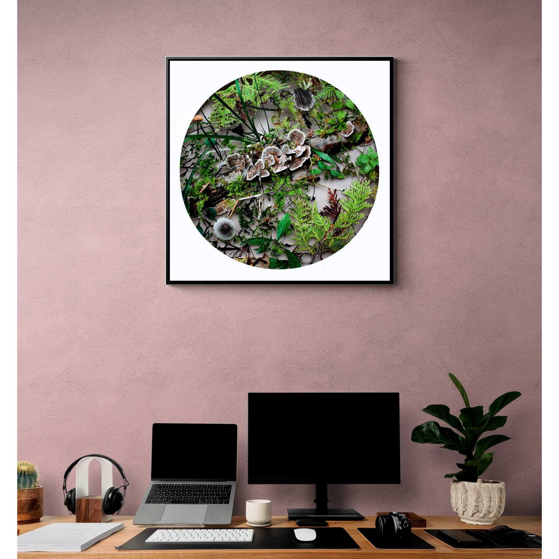 • Custom wood frame with D-rings for installation.