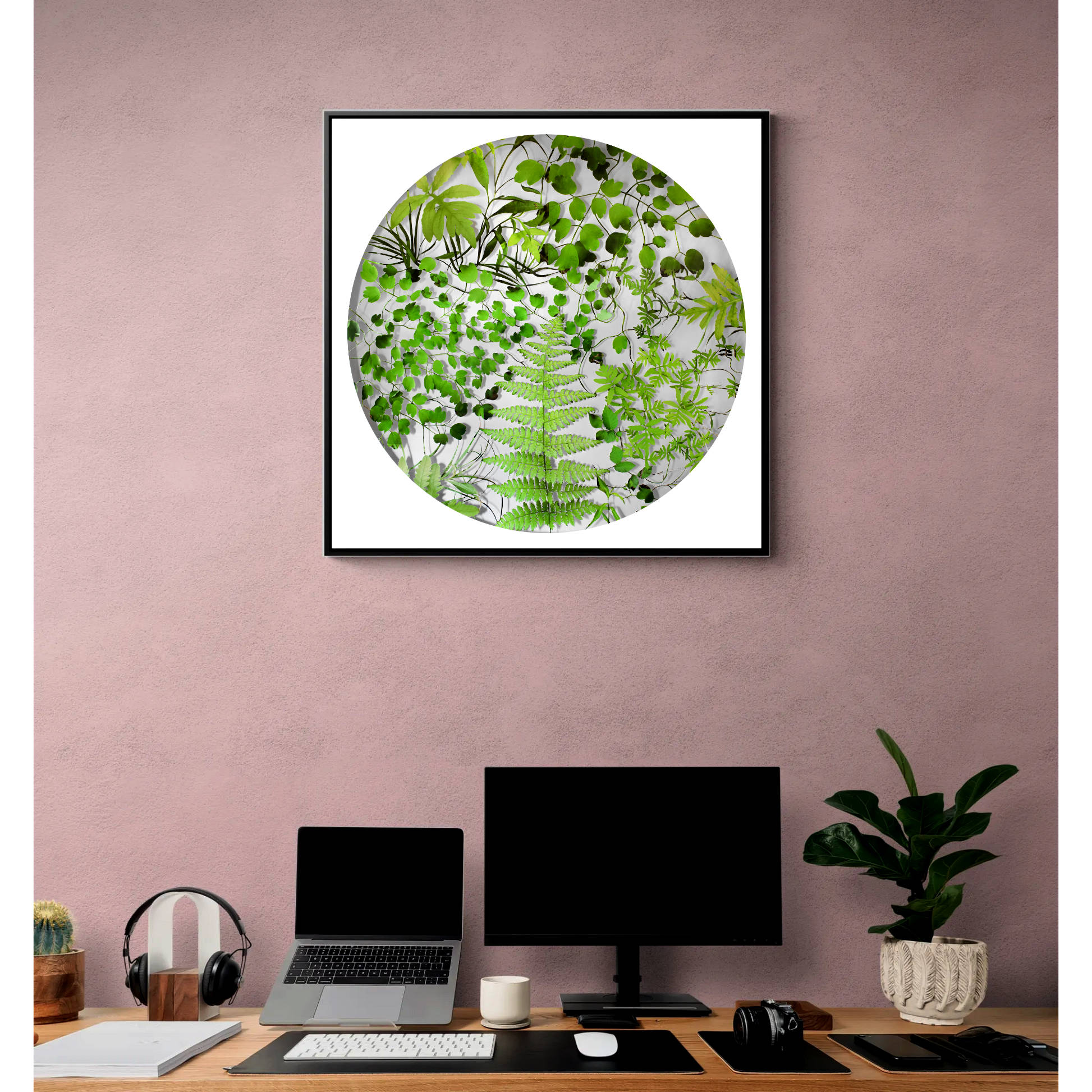 - Custom wood frame with D-rings for installation.