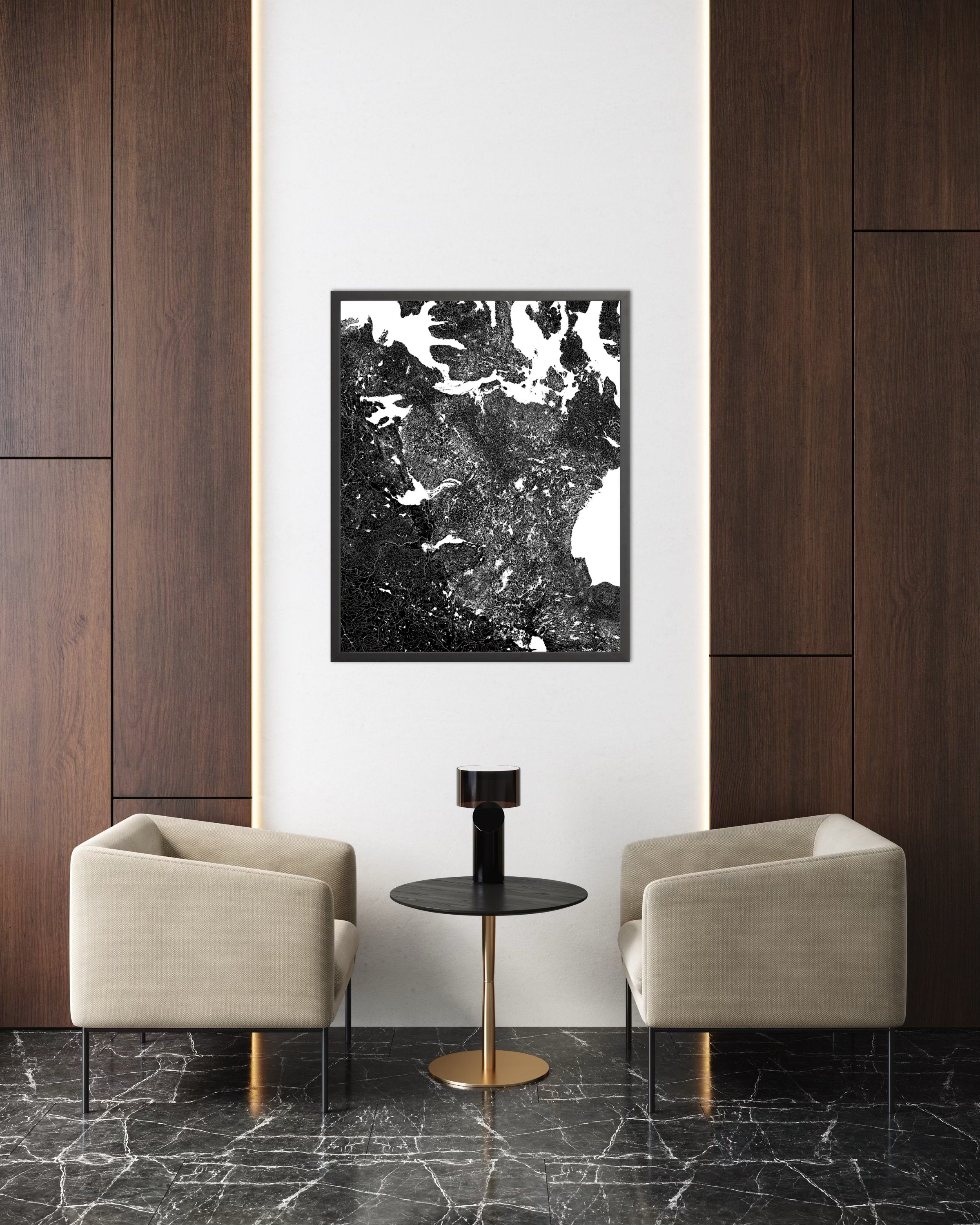 In her series Hydrological Maps of Canada, Joy Charbonneau (OAA, B.A.(Hons), M.Arch) transforms scientific data into visual abstractions that reframe our understanding of the Canadian landscape. Drawing on government hydrological files, she renders every river, lake, creek, and basin as a luminous network of white lines against a solid field of black - stripping away borders, infrastructure, and settlement to reveal the natural architecture of water that shapes the country. The result is a portrait of Canada defined not by political boundaries but by the interconnected systems of water that sustain it. Charbonneau’s work underscores the poetry embedded in environmental systems and the ways data can become both map and metaphor.