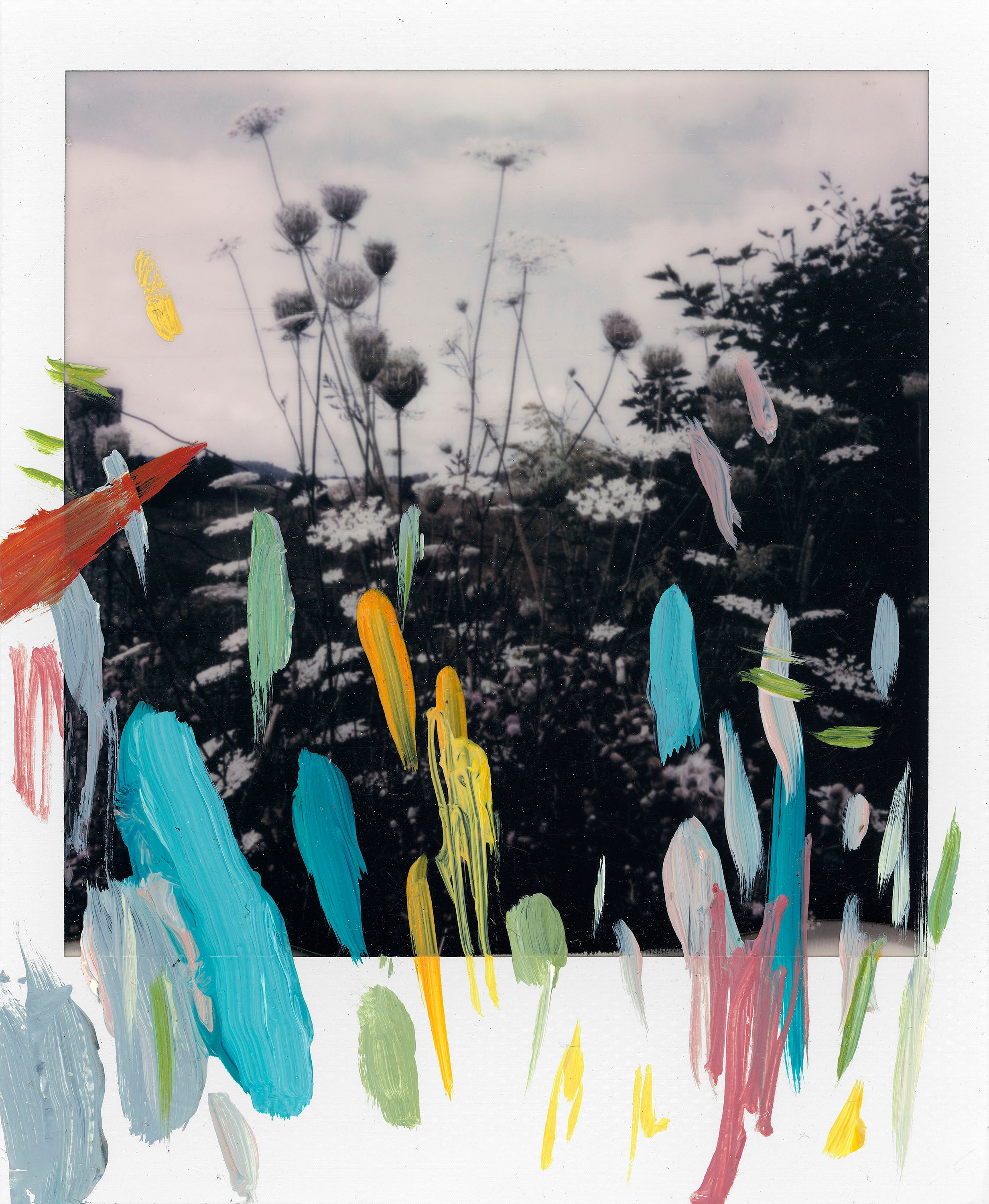 I then paint on the polaroid films allowing the paint to interact with the surface and pre-existing image until a balance is reached. I then scan the painted polaroids so that the paint becomes 'fused' to the original photograph. To me these works explore the relationship between the expressiveness of applied paint and the singular ocular point of vue of instantaneous polaroid photography and play upon the dynamic between control and chance that occurs in these two mediums.”