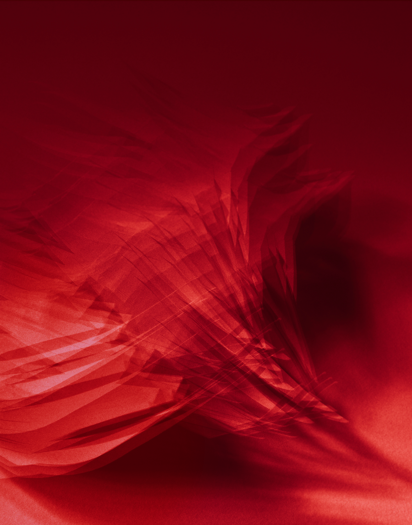 Echoes is an ongoing photographic series beginning in 2018. The process for this series involves creating minimalist color paper shapes, which the artist photographs while air currents slowly dance them around the artist and his camera, hand-held and set on long exposures. Like echoes of sonar fathoming the depth of an unknown yet somewhat familiar environment, the landscape-inspired forms created in these images with their different scale ratios, relay ideas of vastness, plains, cliffs, and summits.