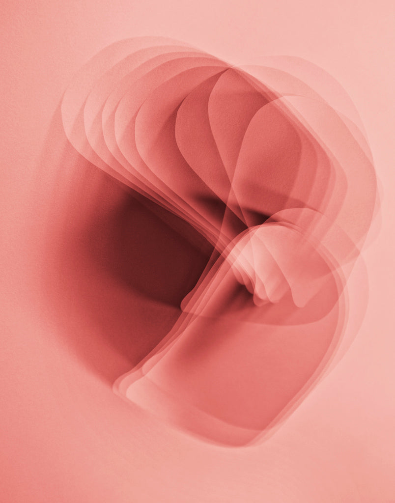 Echoes is an ongoing photographic series beginning in 2018. The process for this series involves creating minimalist color paper shapes, which the artist photographs while air currents slowly dance them around the artist and his camera, hand-held and set on long exposures. Like echoes of sonar fathoming the depth of an unknown yet somewhat familiar environment, the landscape-inspired forms created in these images with their different scale ratios, relay ideas of vastness, plains, cliffs, and summits.