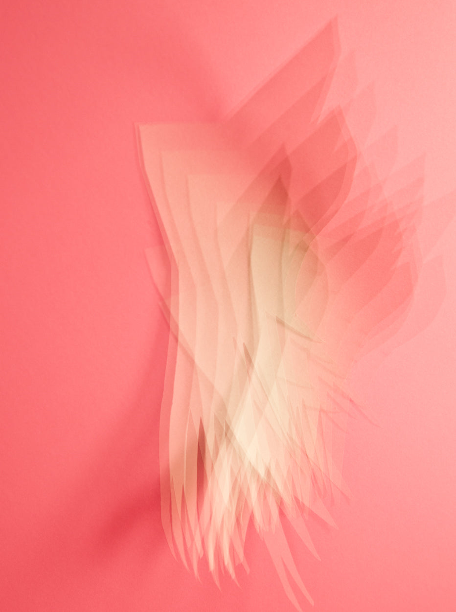 Echoes is an ongoing photographic series beginning in 2018. The process for this series involves creating minimalist color paper shapes, which the artist photographs while air currents slowly dance them around the artist and his camera, hand-held and set on long exposures. Like echoes of sonar fathoming the depth of an unknown yet somewhat familiar environment, the landscape-inspired forms created in these images with their different scale ratios, relay ideas of vastness, plains, cliffs, and summits.