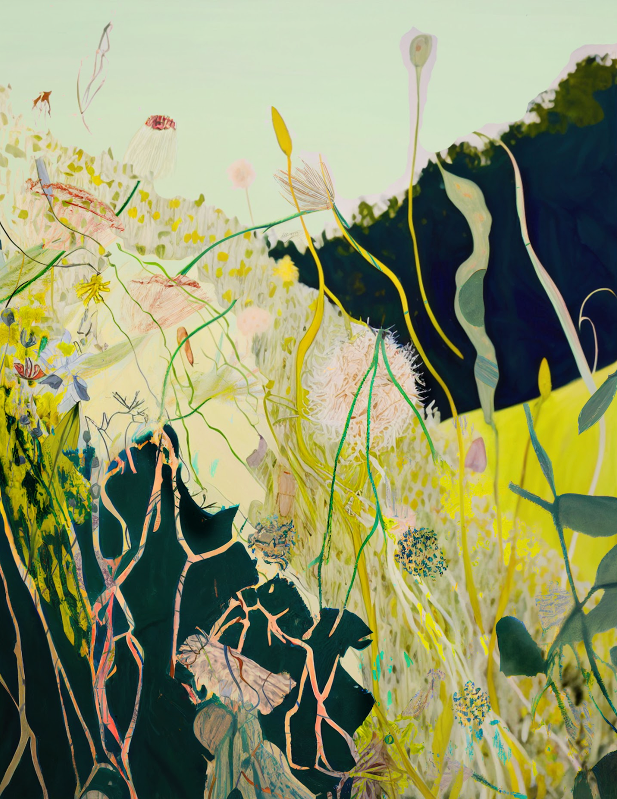 I have used AI-assisted simulations of my drawings and photos to add further abstraction to the imagery, prompting the computer algorithms to simulate extended growth seasons, hybrid plant forms and altered growth patterns to create a series of adaptations and alternative plant forms.