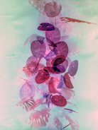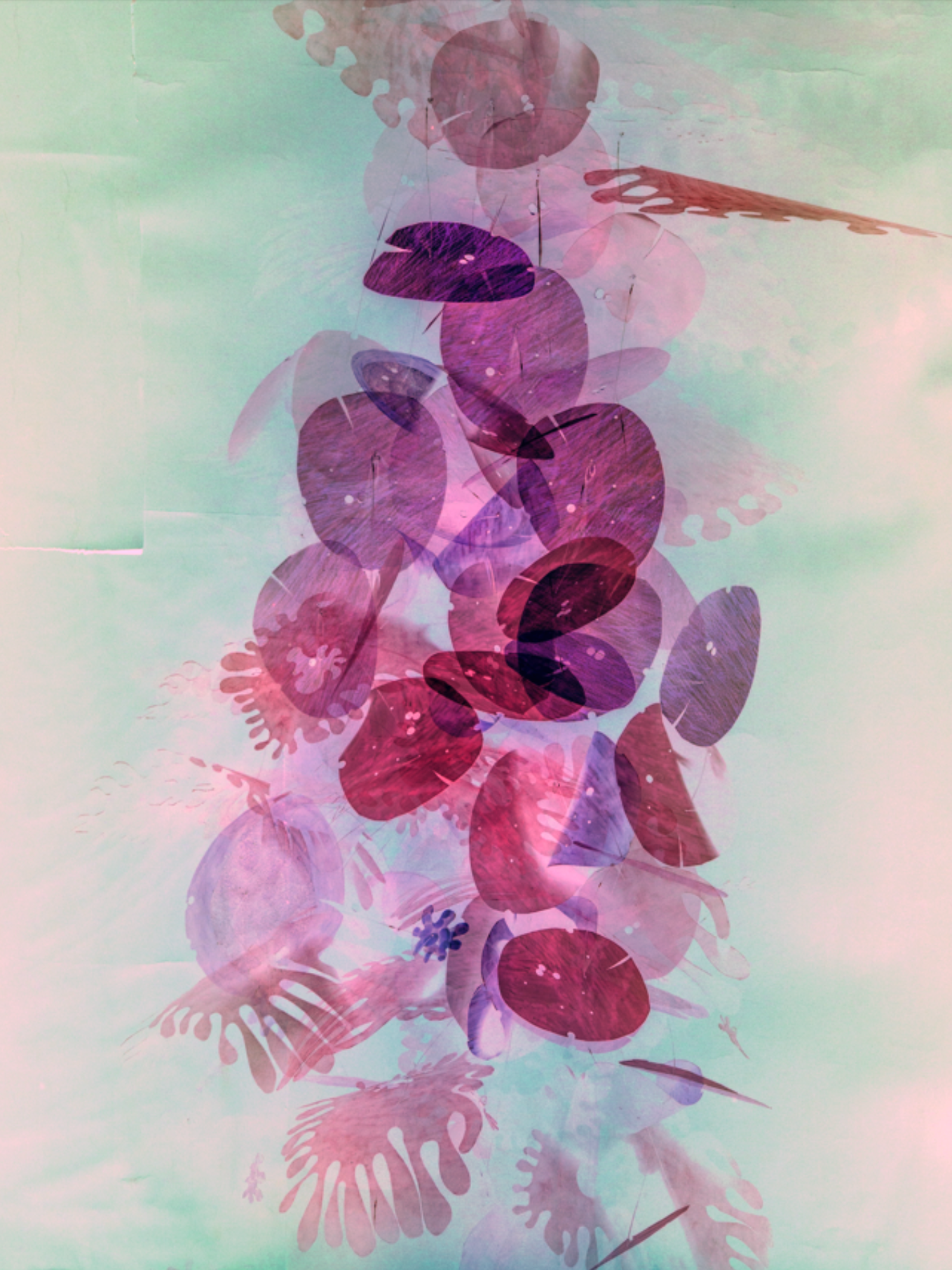 Echoes is an ongoing photographic series beginning in 2018. The process for this series involves creating minimalist color paper shapes, which the artist photographs while air currents slowly dance them around the artist and his camera, hand-held and set on long exposures. Like echoes of sonar fathoming the depth of an unknown yet somewhat familiar environment, the landscape-inspired forms created in these images with their different scale ratios, relay ideas of vastness, plains, cliffs, and summits.