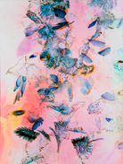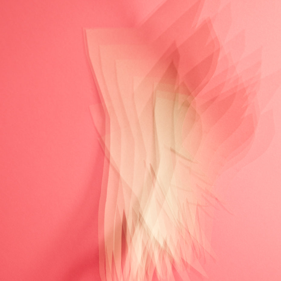 Echoes is an ongoing photographic series beginning in 2018. The process for this series involves creating minimalist color paper shapes, which the artist photographs while air currents slowly dance them around the artist and his camera, hand-held and set on long exposures. Like echoes of sonar fathoming the depth of an unknown yet somewhat familiar environment, the landscape-inspired forms created in these images with their different scale ratios, relay ideas of vastness, plains, cliffs, and summits.